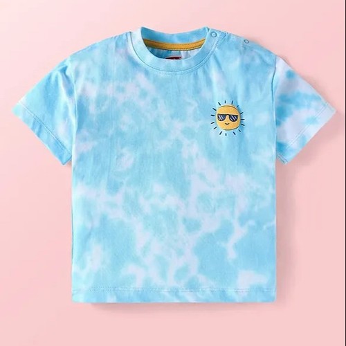 Cotton Knit Half Sleeves Tie & Dye T-Shirt with Beach Theme Print in Back - White & Blue