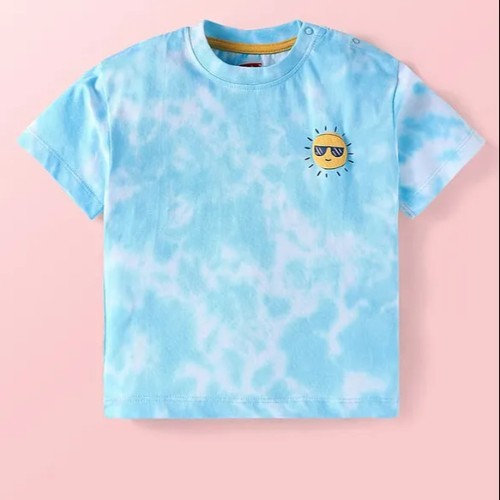 Cotton Knit Half Sleeves Tie & Dye T-Shirt with Beach Theme Print in Back - White & Blue
