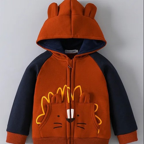 Full Raglan Sleeves Hooded Sweatjacket With Lion Print & Kangaroo Pockets